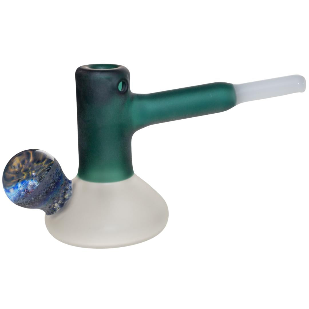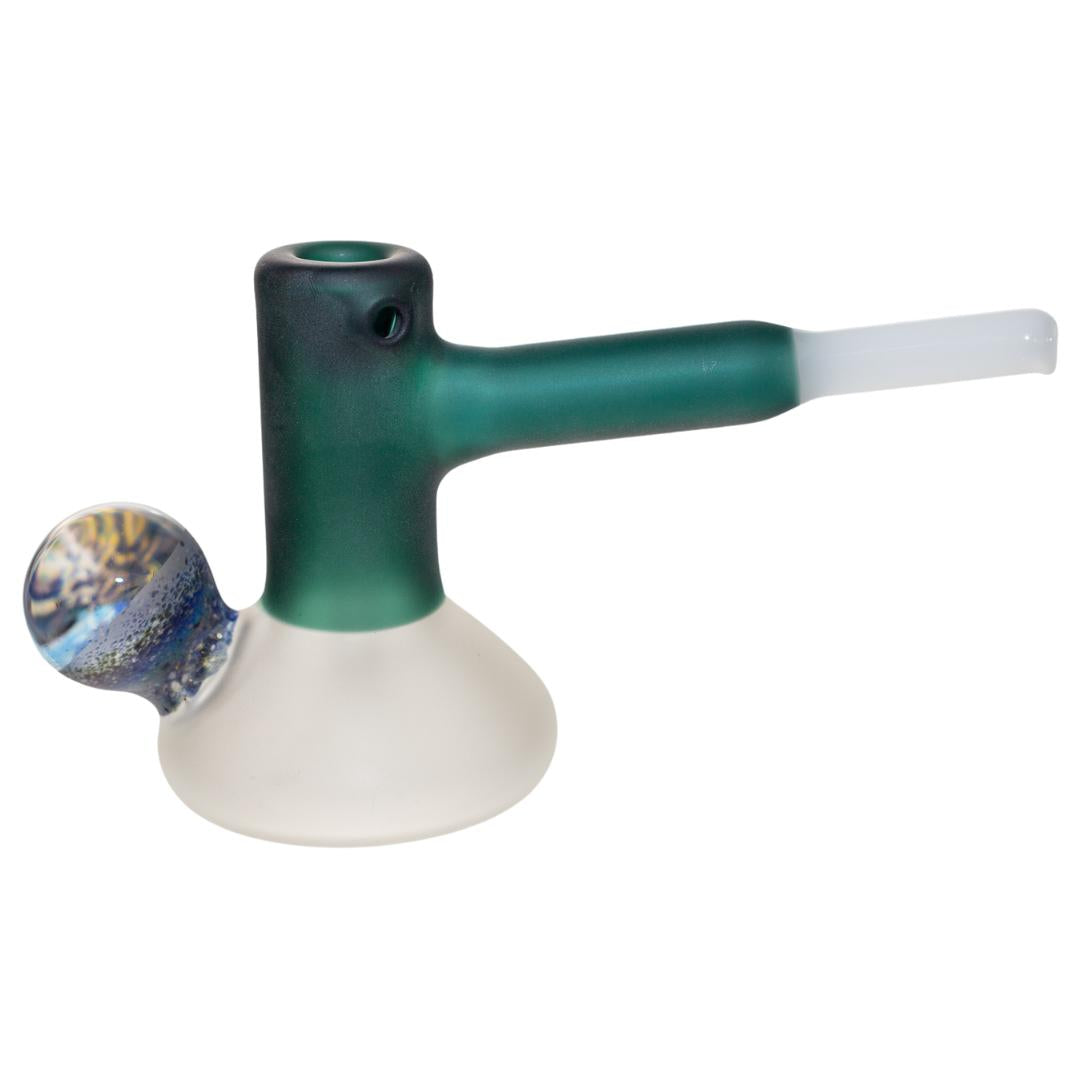 This american made hammer bubbler features a large galaxy marble on the very front and a clear frosted bottom. The body of the hammer is a frosted dark emerald green followed along with a glossy white mouthpiece.