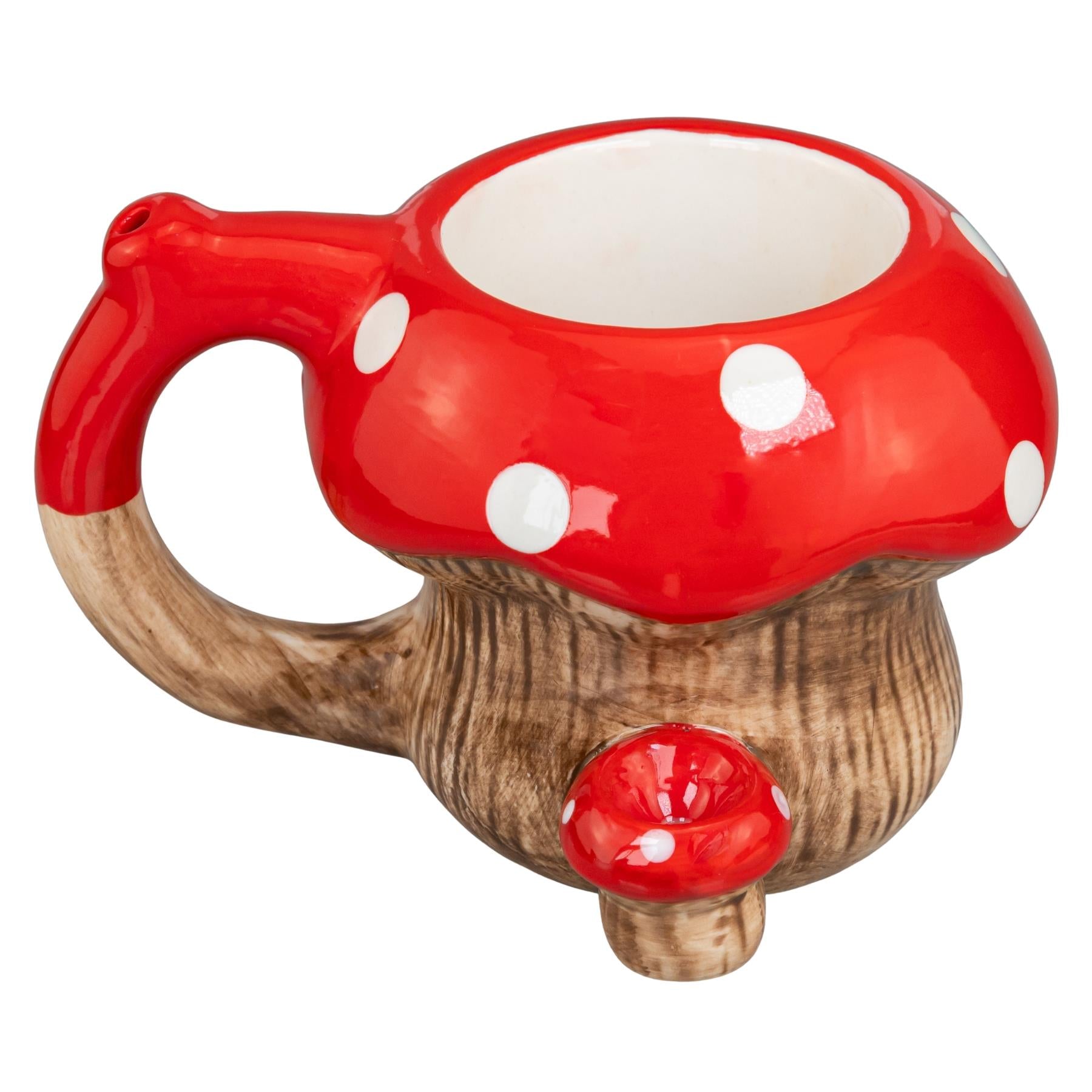 Red Mushroom Ceramic Pipe Mug, slight side angle on a white background - Up N Smoke