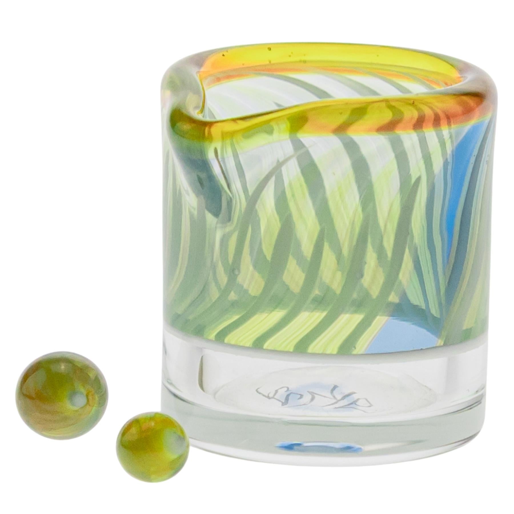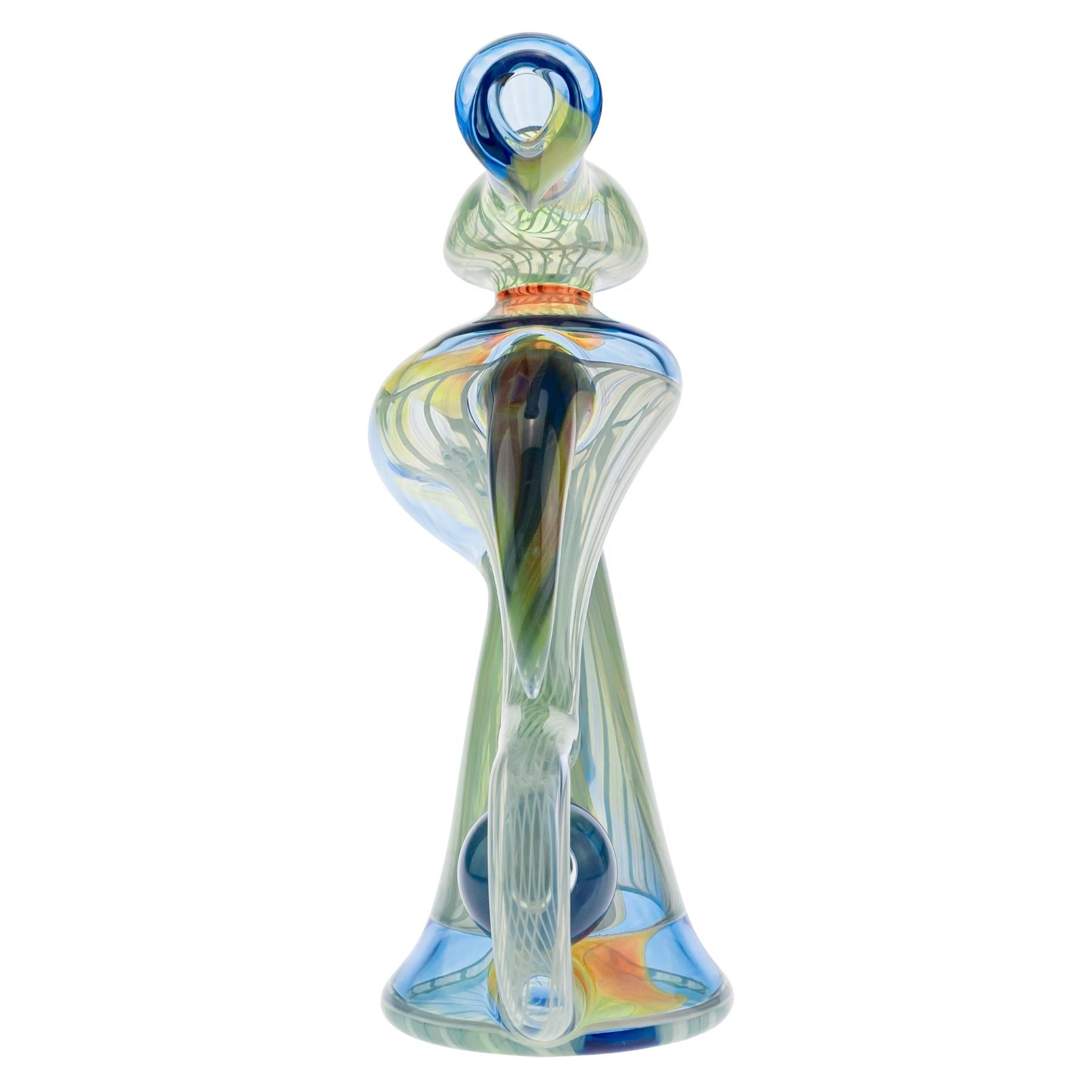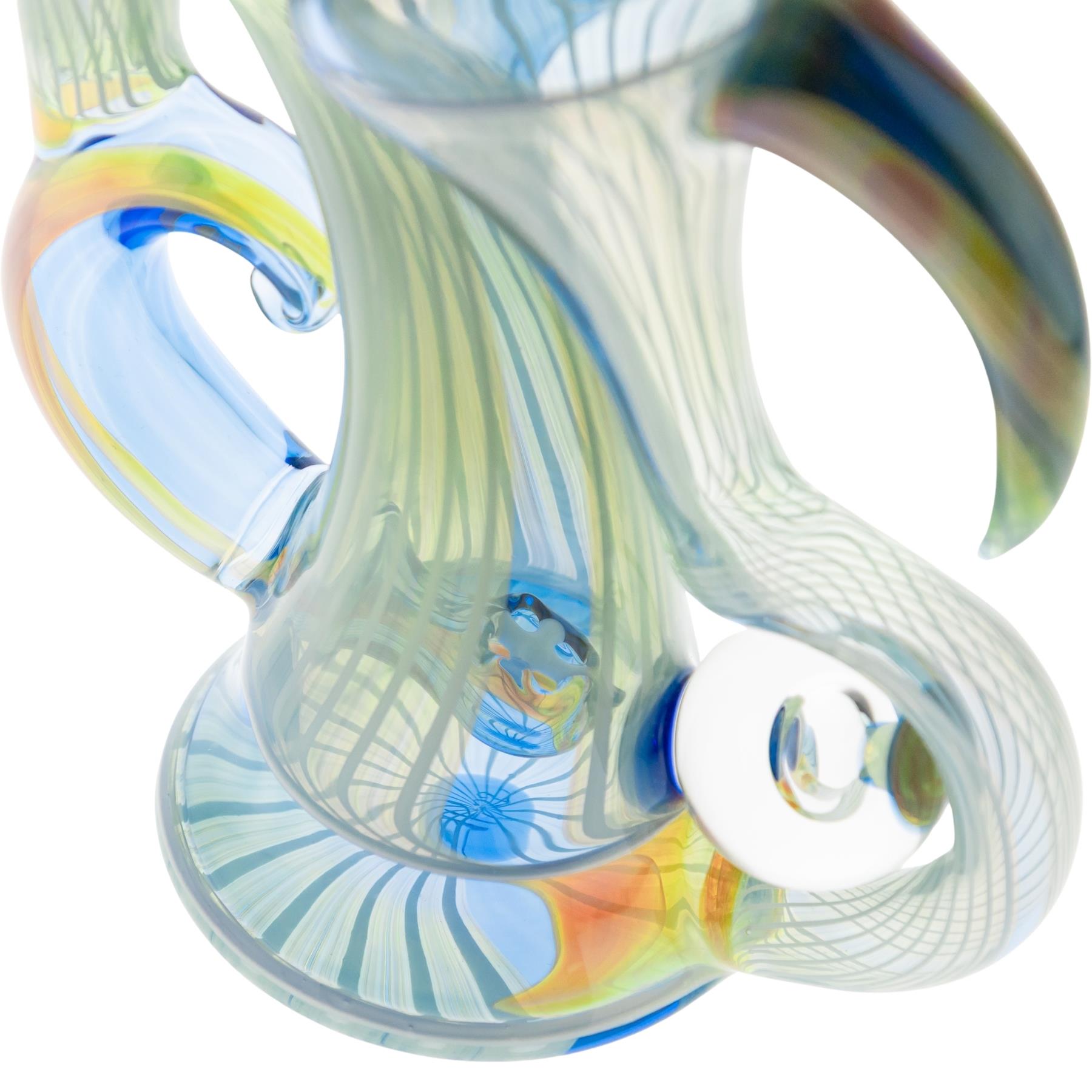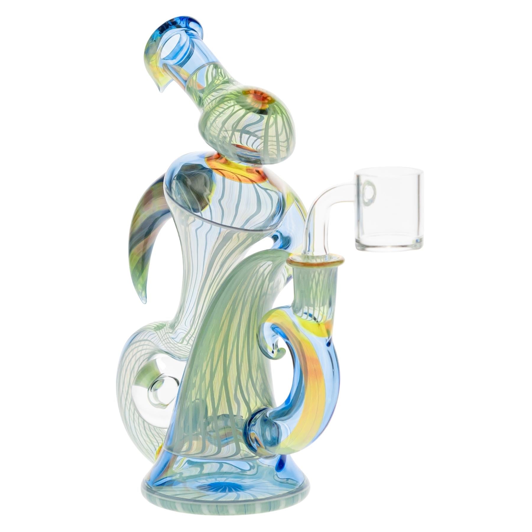 The GK Recycler Kit is an American-made, fully equipped glass setup designed for smooth performance and standout aesthetics. This intricately worked recycler features continuous water circulation for enhanced cooling and cleaner, more flavorful draws. The sculpted design promotes efficient airflow while showcasing vibrant layered colors and detailed linework throughout the body. Built for both function and visual impact, it delivers reliable performance session after session. The kit includes a quartz bucket, a matching carb cap, terp pearls, and a coordinating dab jar for a complete, ready-to-use setup. Ideal for enthusiasts who value craftsmanship, quality materials, and refined functionality in one cohesive package.