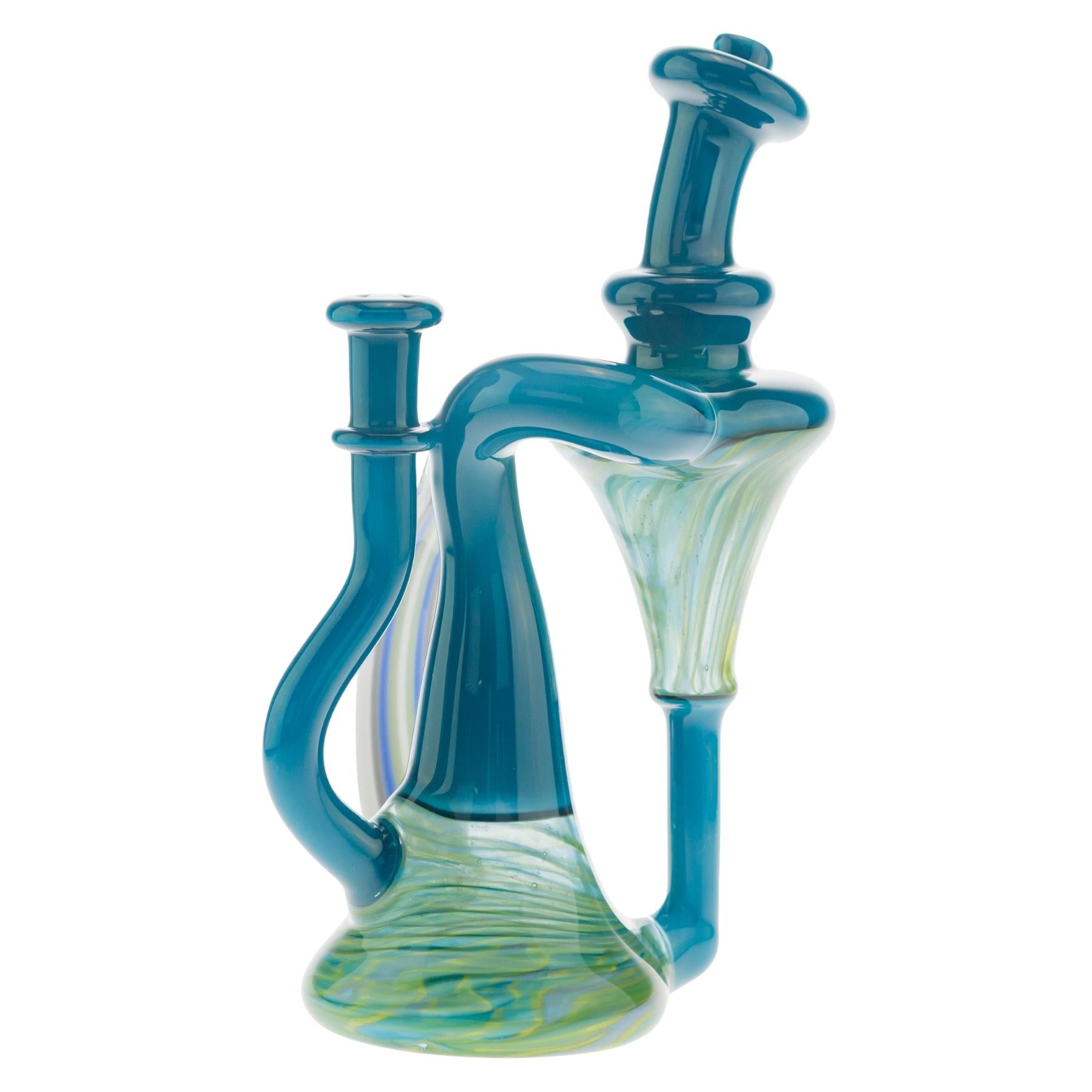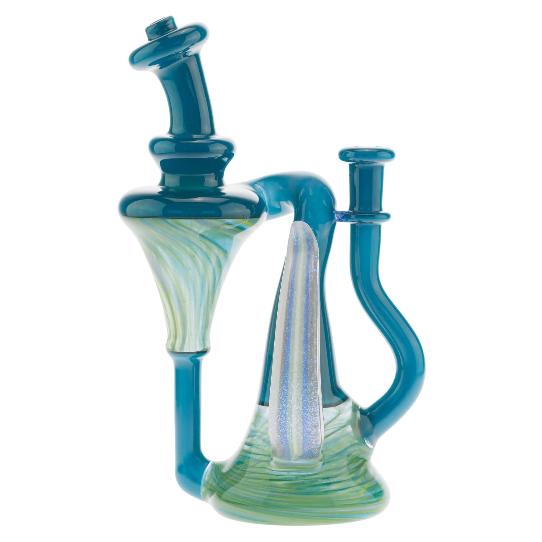 The Terry Sharp Recycler is a beautifully crafted American-made rig that blends strong function with eye-catching glasswork. Standing 8 inches tall with a 3-inch base, this recycler provides excellent stability while delivering the smooth, consistent filtration that recycler rigs are known for. The deep blue body is accented with a vibrant mix of green and blue tones worked into the base and neck, creating a rich layered look throughout the piece. A standout feature is the sculpted leaf connection that bridges the chamber to the neck, made with dichro for a shimmering effect under light. Paired with a 10mm joint, this rig offers smooth airflow and efficient recycling action, making it both a functional daily driver and a visually striking display piece.