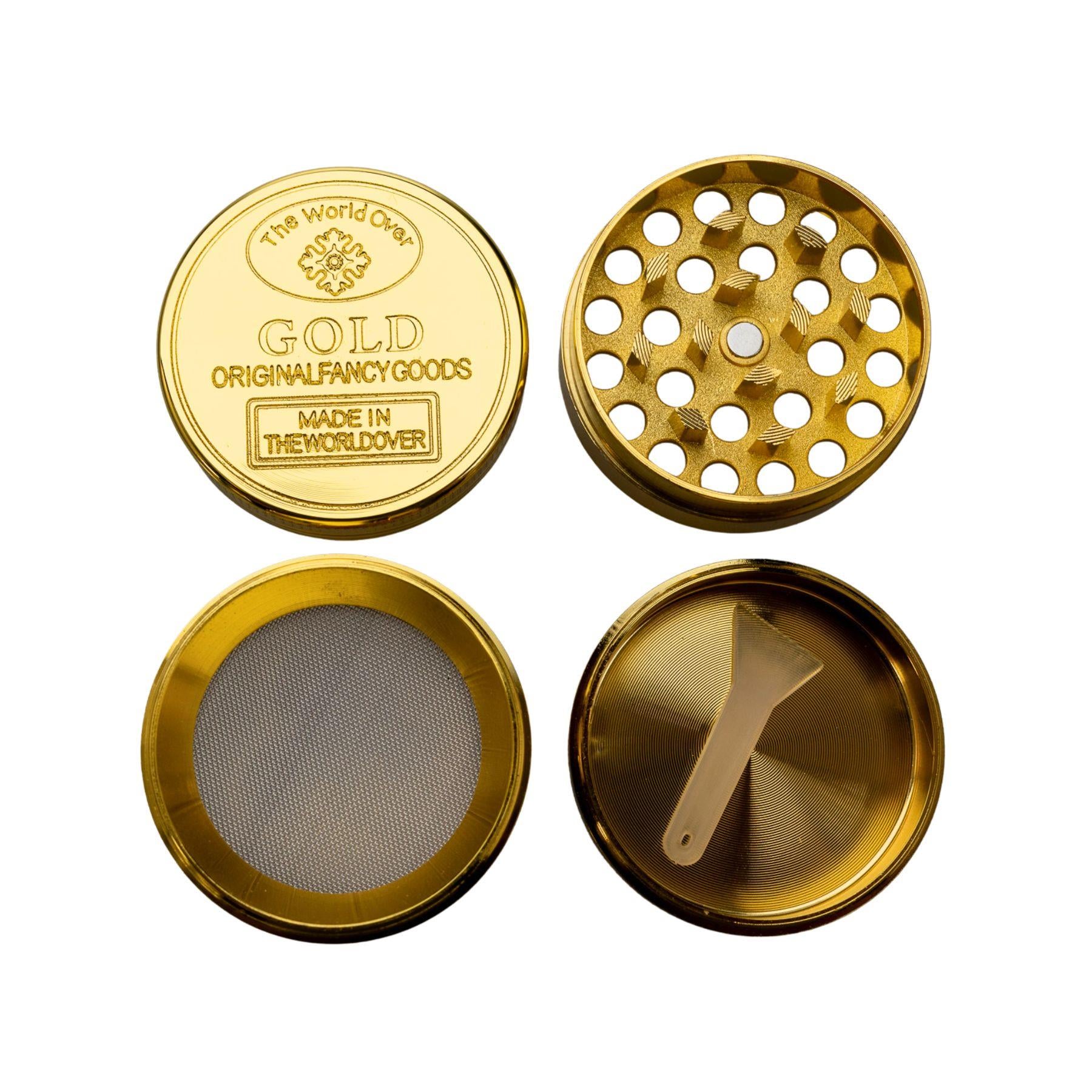 Designed with four compartments, it features sharp teeth for easy grinding, a secure middle chamber for storage, and a bottom compartment equipped with a mini shovel tool, allowing you to scoop your herbs with ease. The polished gold finish adds a touch of luxury to your sessions while keeping things practical and portable.