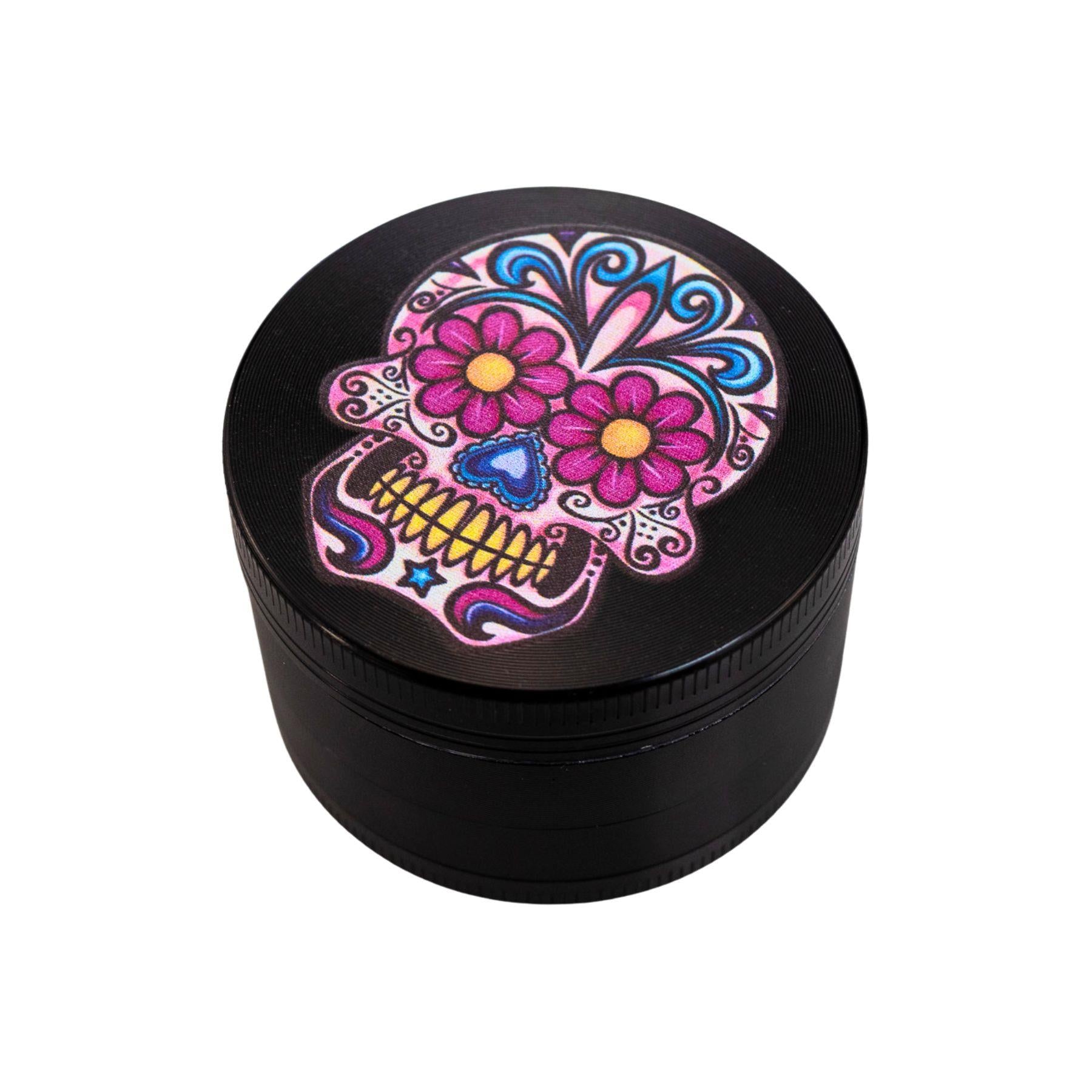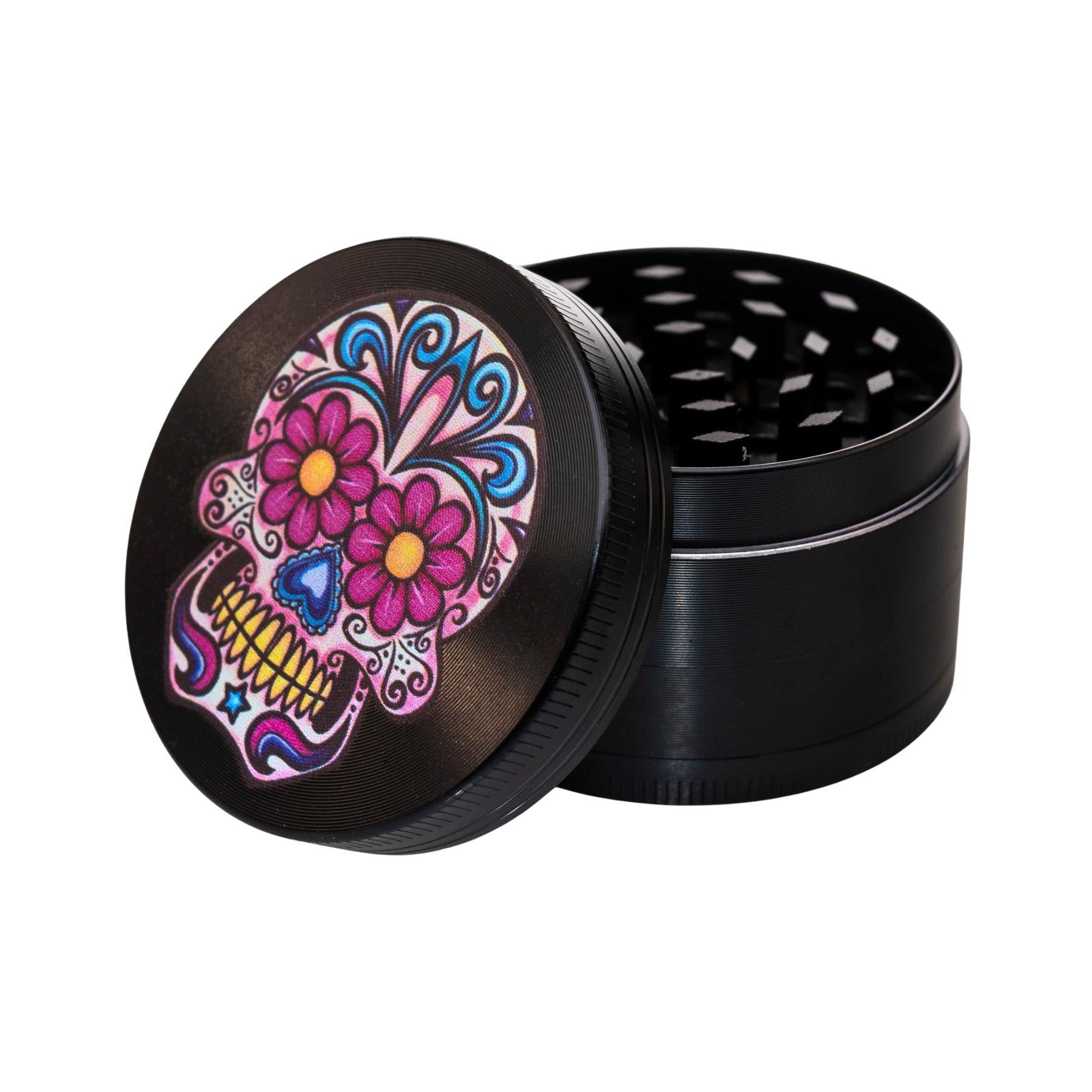 The sharp diamond-shaped teeth make grinding easy, while the layered design includes separate compartments for grinding, storage, and collection. The bottom chamber even comes with a scoop tool so you can retrieve your herbs with ease. Finished with a vibrant sugar skull design, this grinder blends functionality with artistic flair.