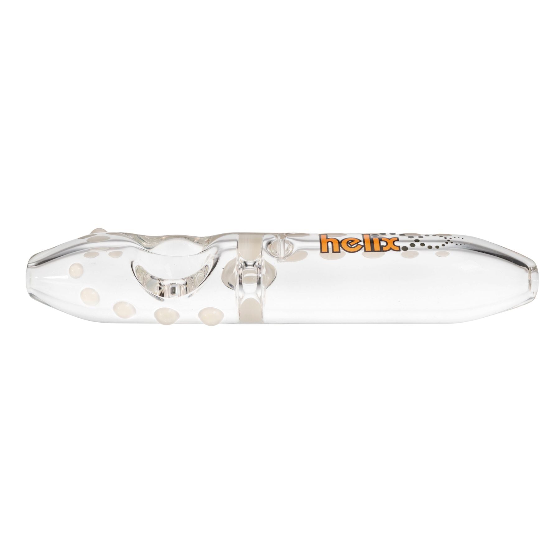 "Left-side view of an American Helix Classic Steamroller with an orange logo decal and decorative white glass beads," - Up N Smoke.