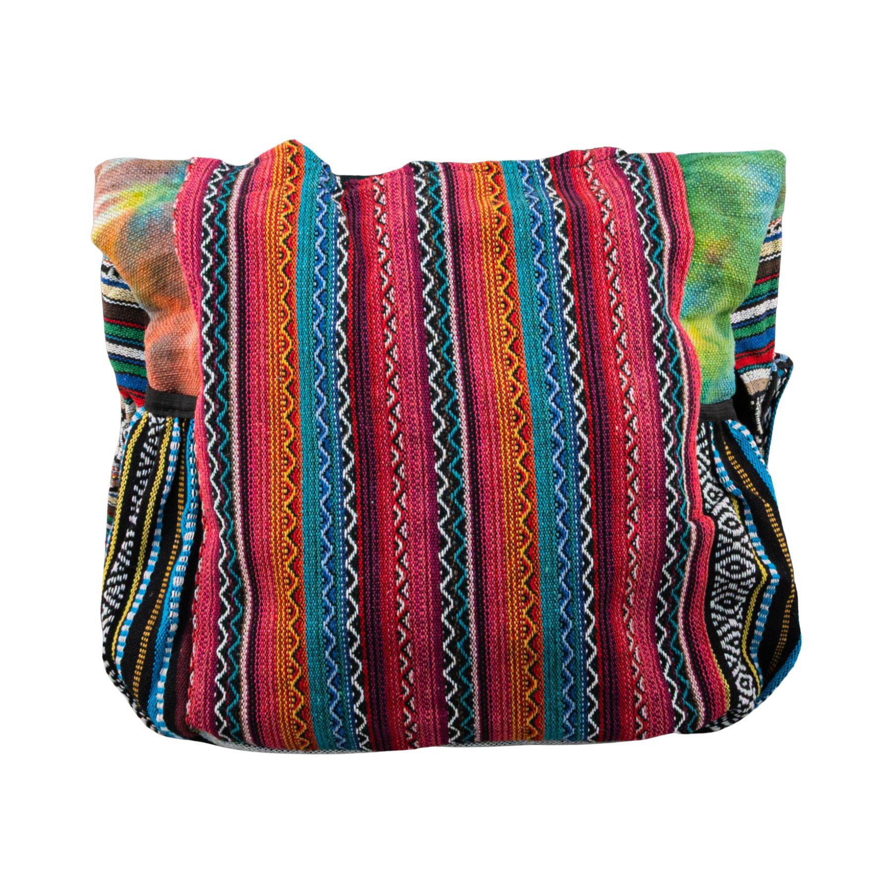 Handmade in Nepal from eco-friendly Himalayan hemp, this 17" x 15" bag combines bold color, durable craftsmanship, and functional design. The lively tie-dye pattern and mushroom patchwork make it a true statement piece, perfect for free spirits and festival lovers alike. With multiple compartments and a secure closure, it’s as practical as it is eye-catching.