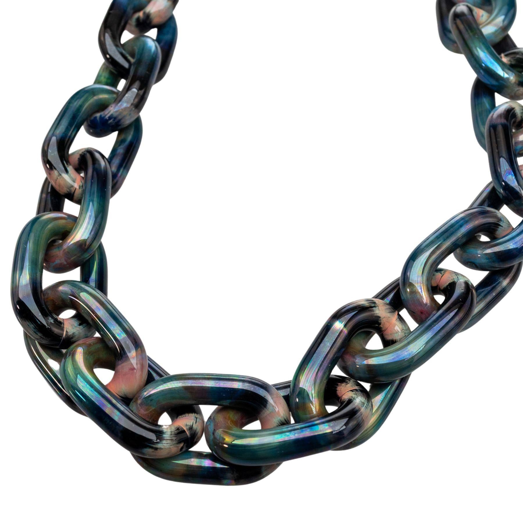 Turn heads with the bold and artistic WHAM Glass Chain. Handcrafted from high-quality glass, this statement piece features chunky, interlinked glass chain links with a mesmerizing iridescent finish that shifts color in the light.