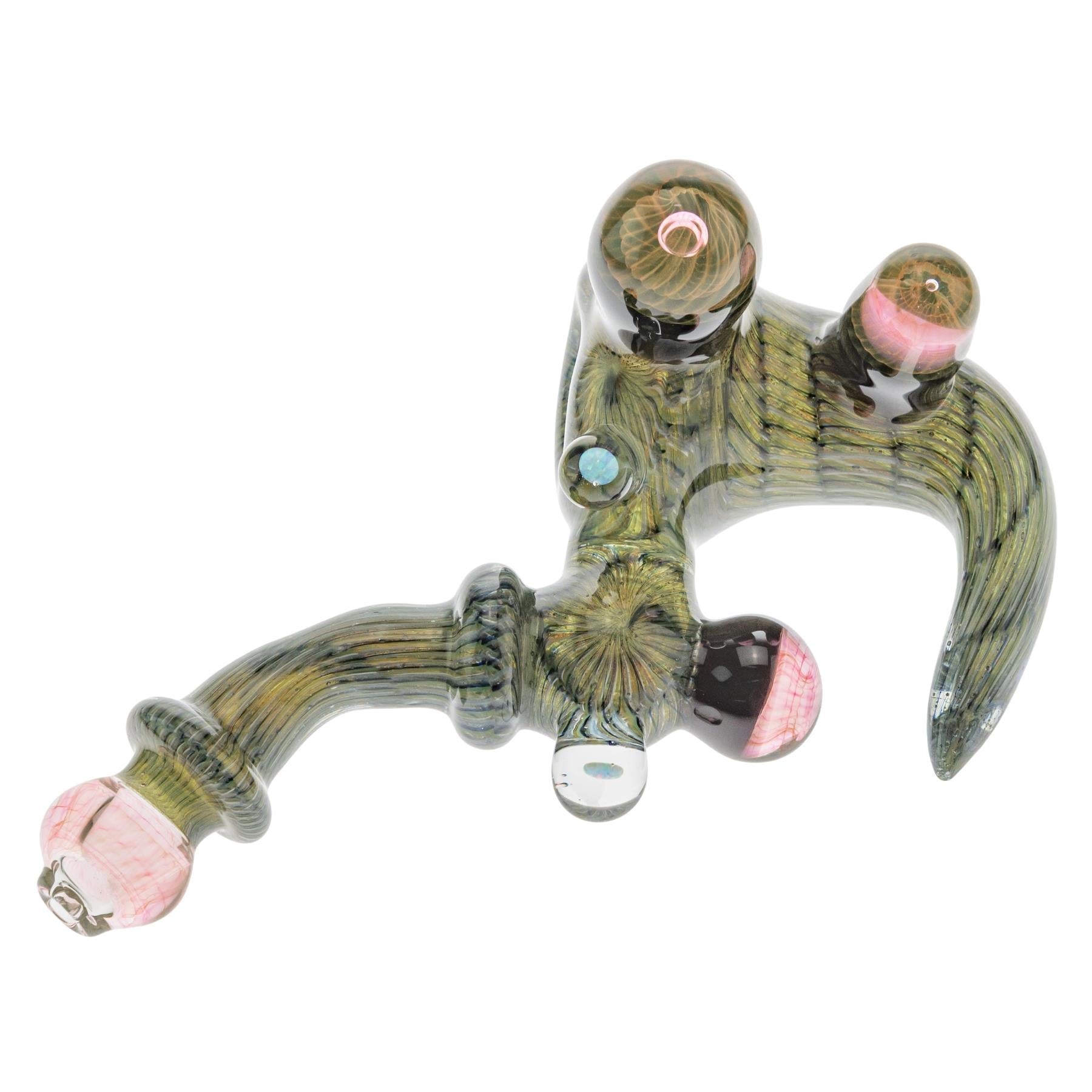 The Blue Jay Coilpot Sherlock Pipe blends classic shape with detailed glass artistry. Measuring 6.5” in length, this fumed piece features a rounded coilpot body with layered, scale-like pattern work that shifts in tone as it’s used. Soft pink fumed accents add contrast, while the curved Sherlock-style neck provides a comfortable grip and smooth draw. Balanced and eye-catching, this pipe combines standout craftsmanship with rich, color-changing character over time.