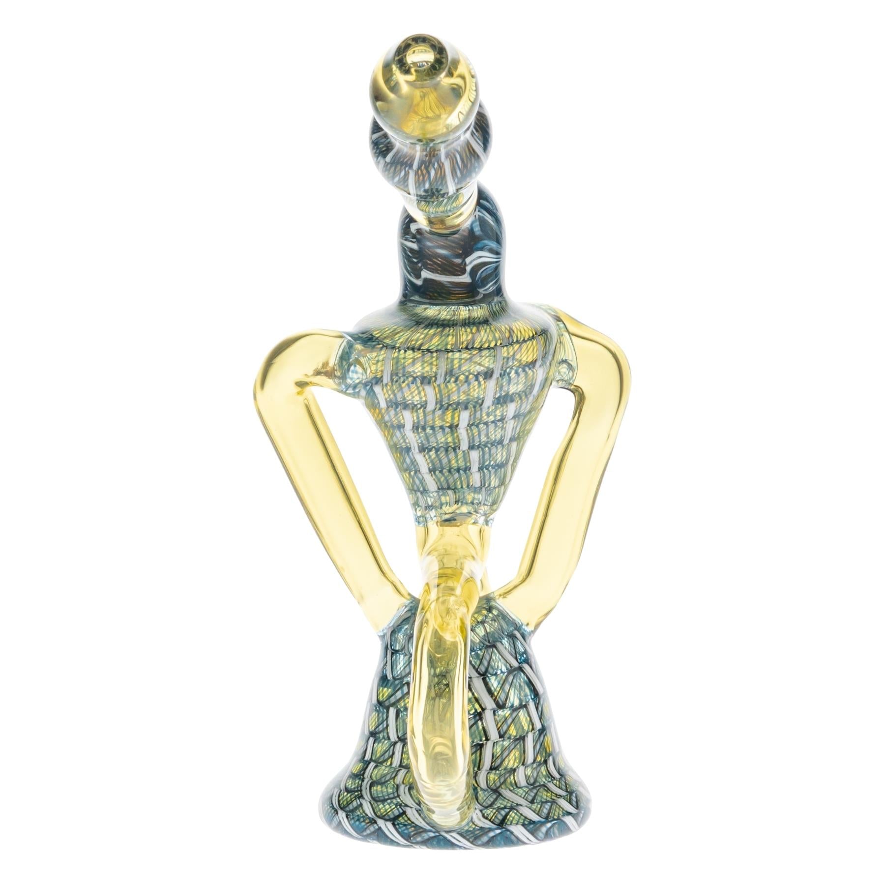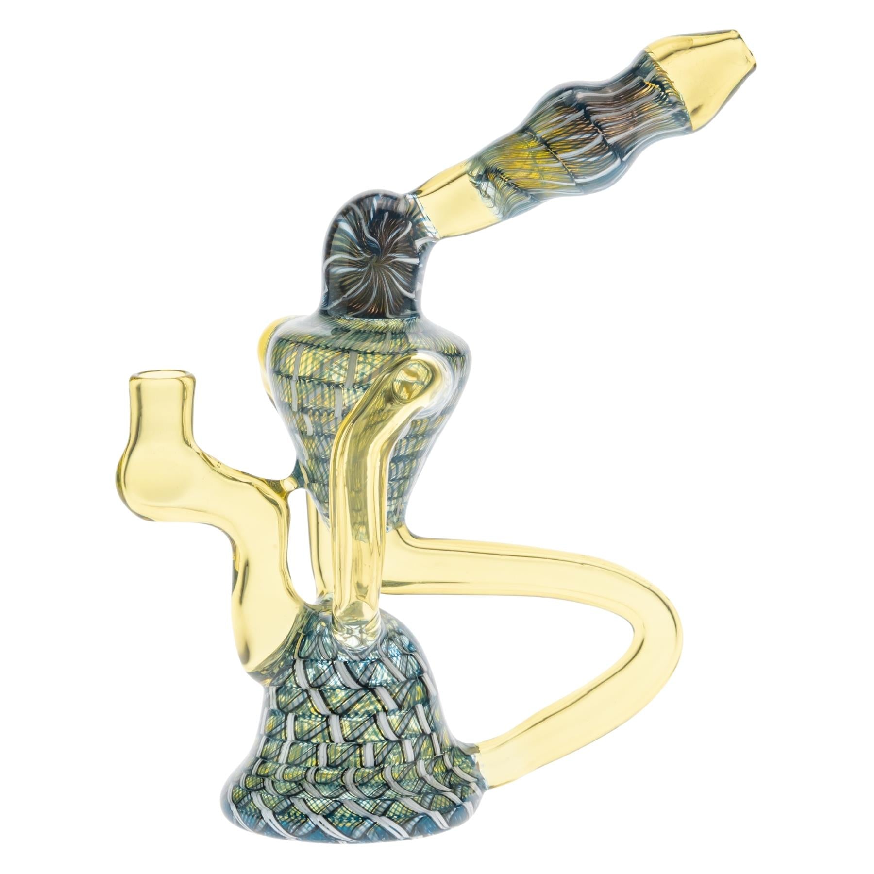 The Blue Jay Coilpot Recycler Serum Rig is a striking fusion of sculptural design and high-function performance. Standing 7” tall with a 2.2” base diameter, this compact recycler features a fixed downstem and a 10mm slide joint, delivering efficient airflow in a stable, display-worthy form. The intricate coilpot patterning wraps the body and base in layered, woven detail, while the serum-yellow accents contrast beautifully against the cool blue tones for a bold, dimensional look. Engineered with a recycler system that continuously cycles water through the chambers, this piece provides smooth, cooled draws in a compact footprint. Both functional and visually captivating, this rig is a standout addition to any collection.