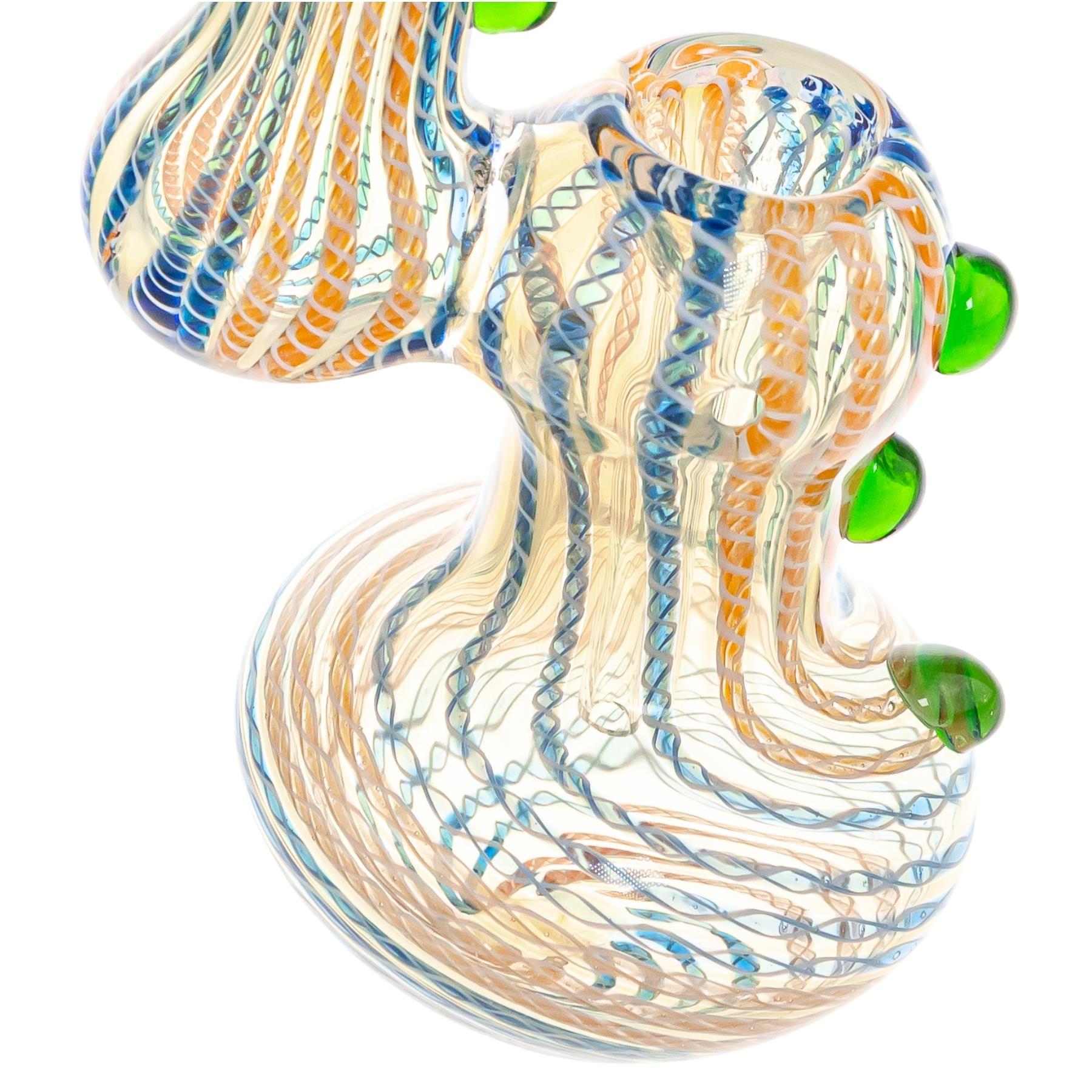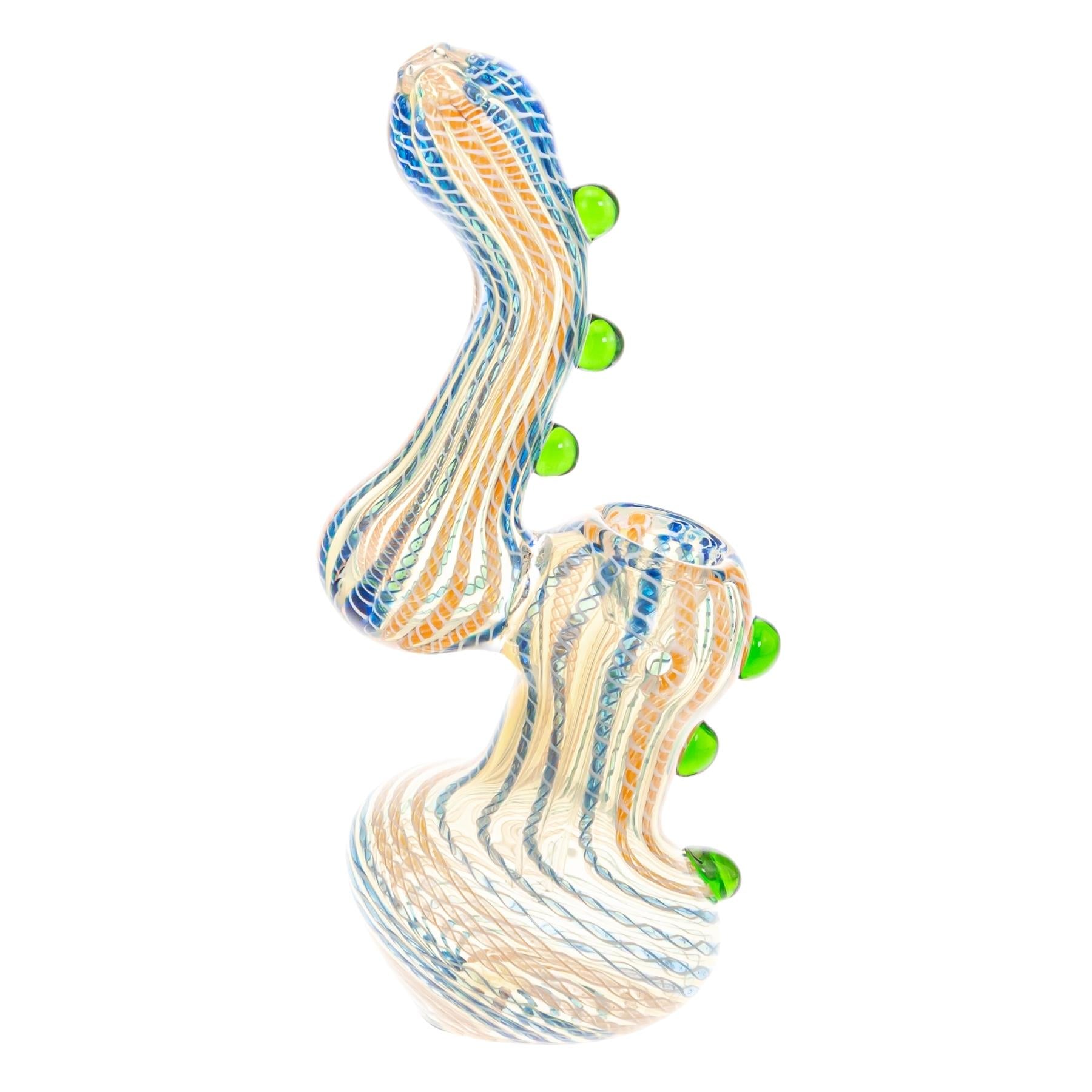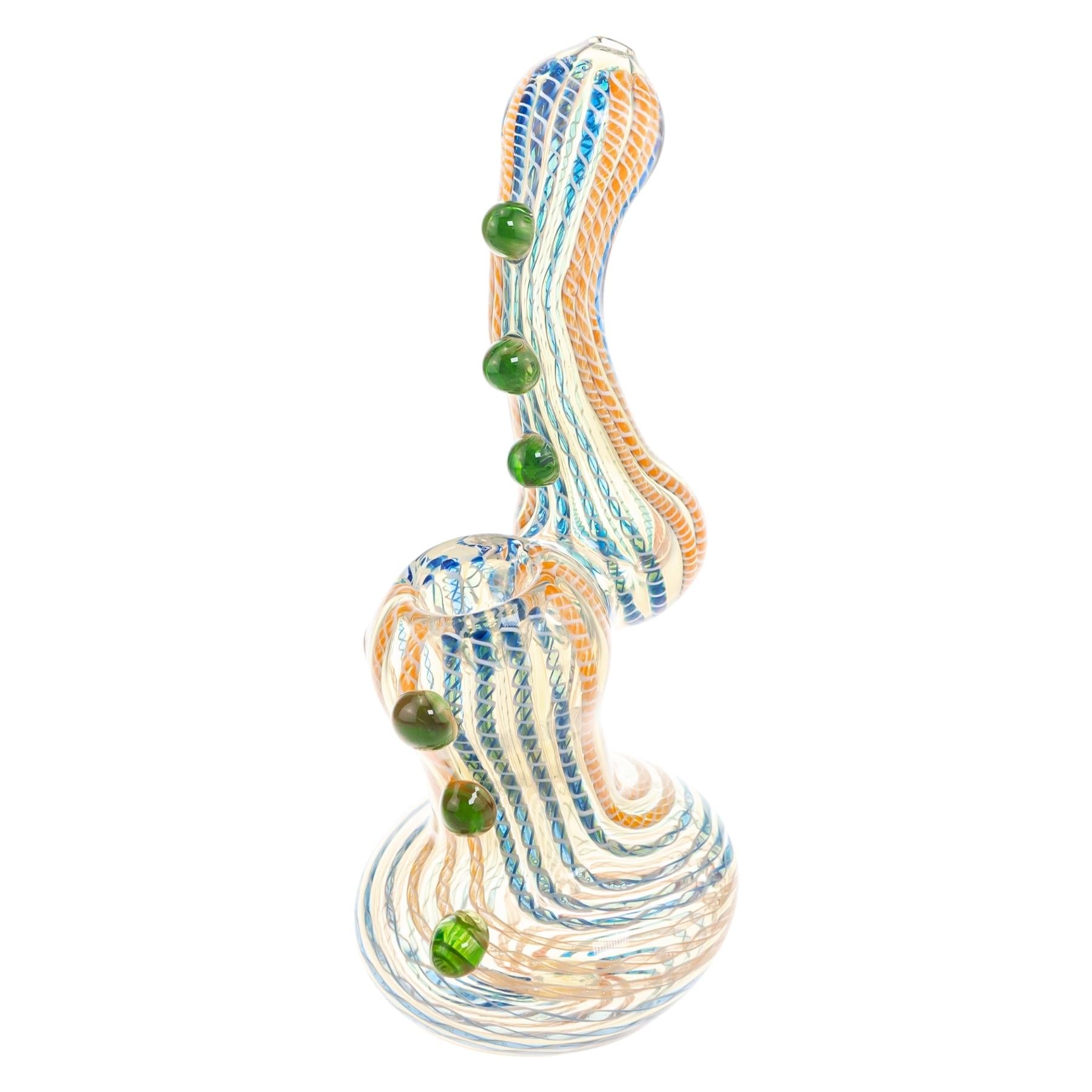 This Sherlock-style bubbler is individually handcrafted from fumed glass, giving it rich color depth that naturally develops character over time. Measuring approximately 6.8 inches tall, it features a textured body with raised glass accents for enhanced grip and visual detail, along with a stable, rounded base and integrated water chamber for smooth, cooled draws. The curved neck provides comfortable handling and balanced airflow, making it both a functional daily piece and an eye-catching addition to any collection.