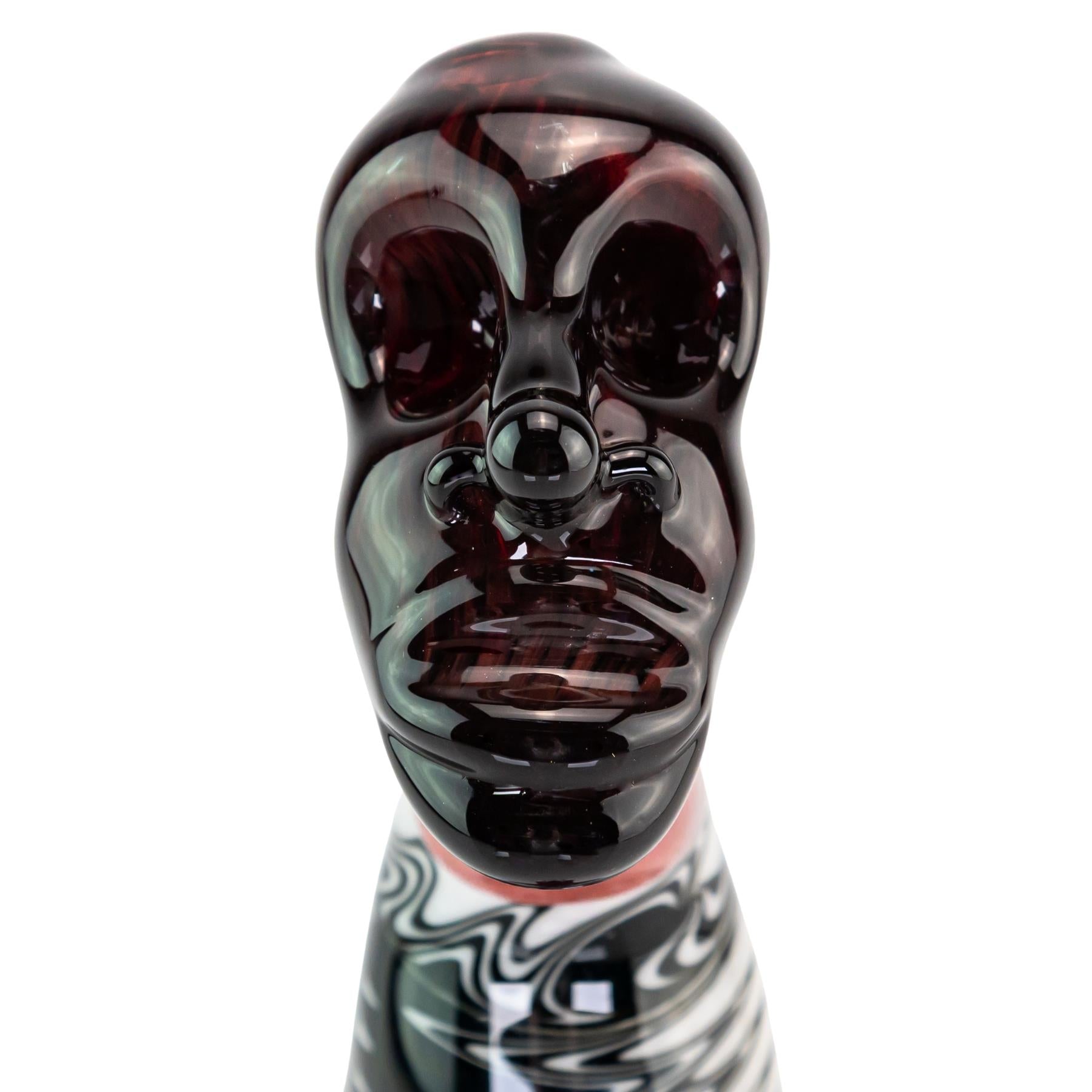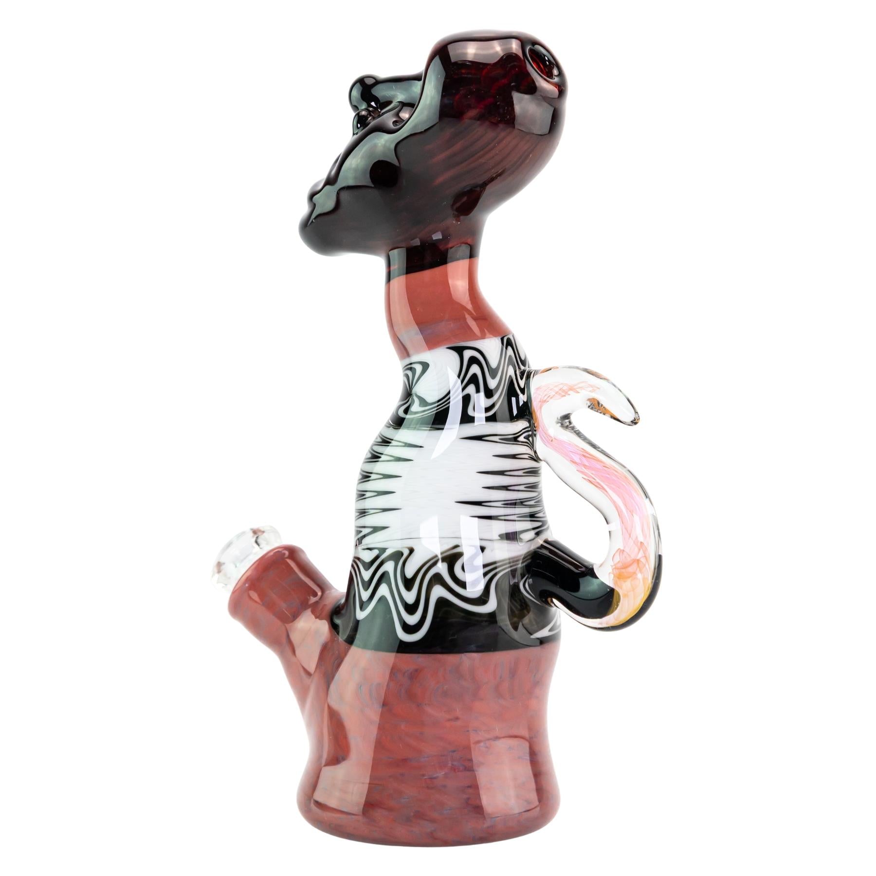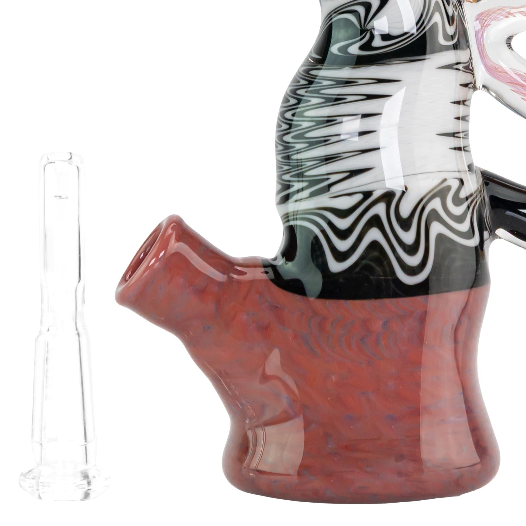 The Sotochotic X Scoby Wig Wag Buddha Rig is a bold, sculptural statement piece that blends technical precision with expressive artistry. Standing 7 inches tall with a 2.2-inch base diameter, this 10mm rig features a removable downstem for easy maintenance and smooth function. The body showcases crisp black and white wig wag linework that wraps around the torso in clean, hypnotic waves, contrasted by a rich, marbled red base that gives the piece visual weight and balance. The sculpted Buddha head top adds dramatic character with deep ruby tones and defined facial contours, while the clear side handle is accented with detailed fumed glass flame work in warm pink and golden hues. The fumed flames are sealed within the design and will not change color over time. American-made and meticulously finished, this rig combines functional performance with standout artistic presence, making it equally at home in rotation or on display.