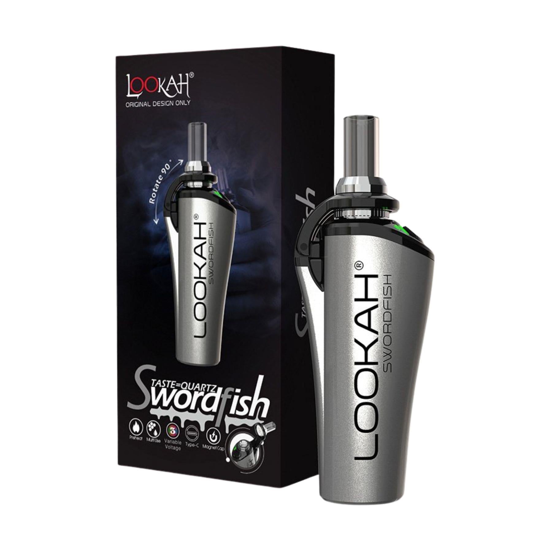 "A grey Lookah Swordfish Concentrate Vaporizer in front of its packaging on a white background," - Up N Smoke.