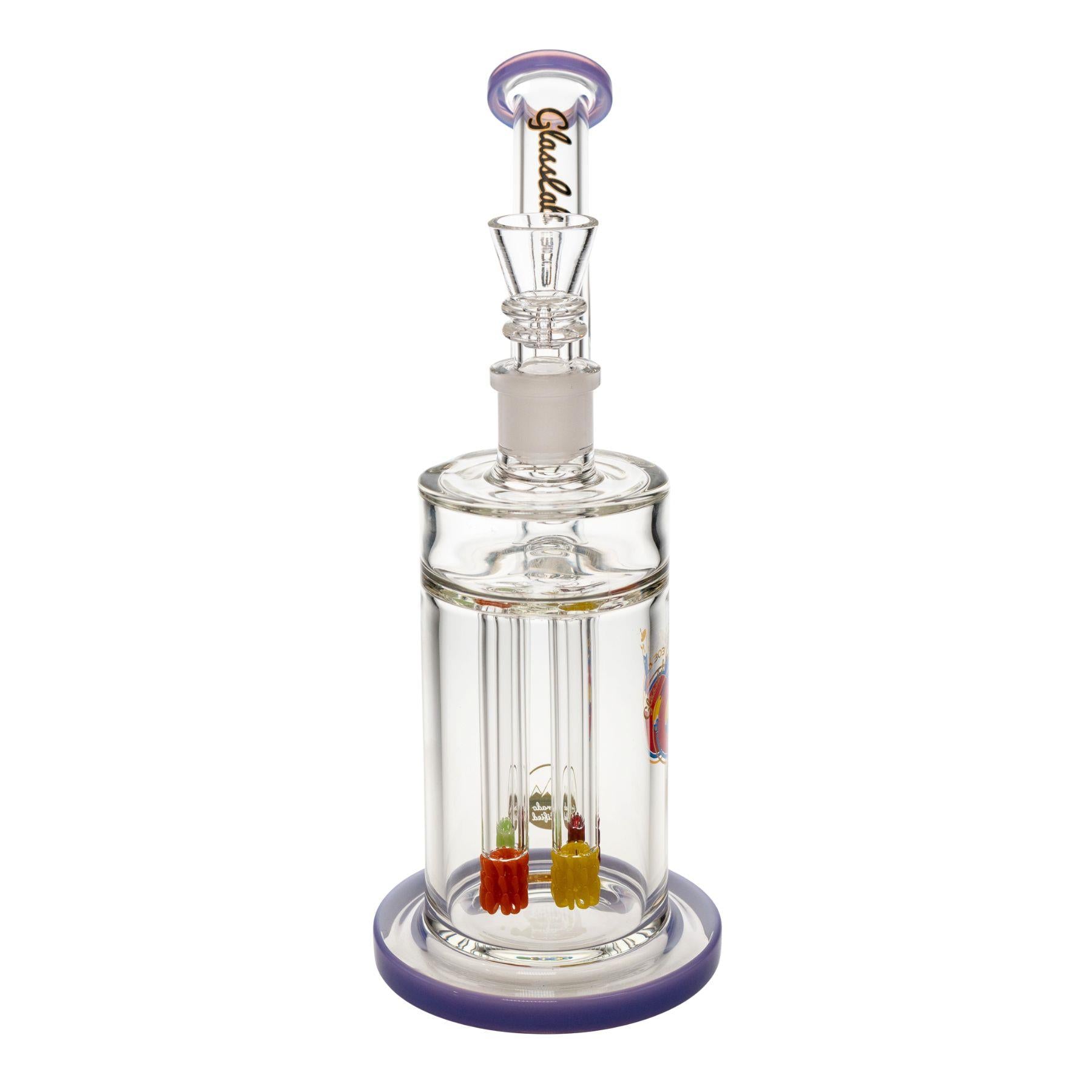 Experience next-level filtration with the Glasslab 303 Quadruple Colored Lace Water Pipe. Standing 9 inches tall with a sturdy 3.75-inch base, this piece is crafted from 5mm thick glass for long-lasting durability. It features four stacked colored lace percs that work together to deliver ultra-smooth, cooled hits every time.