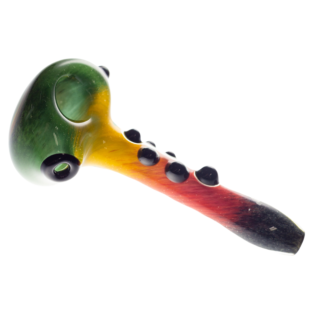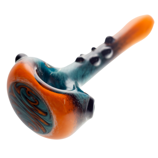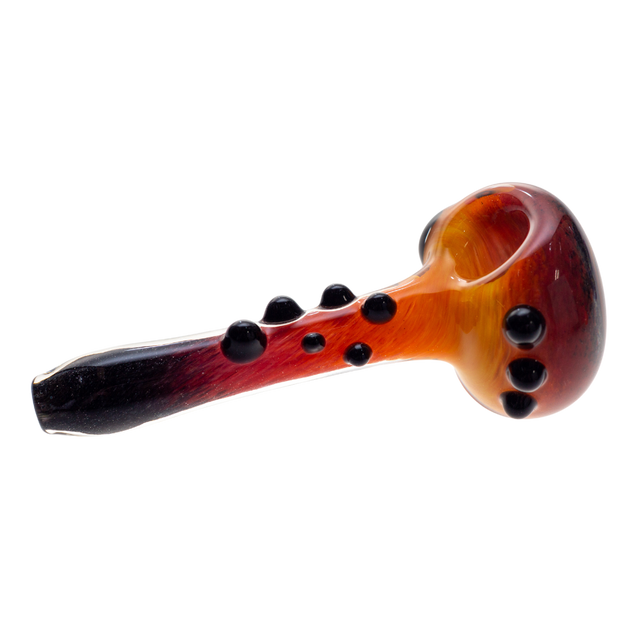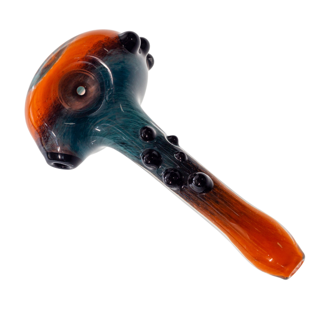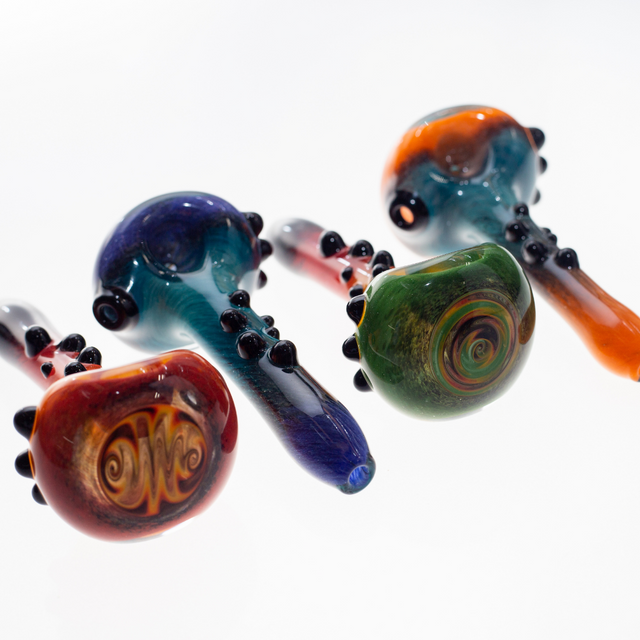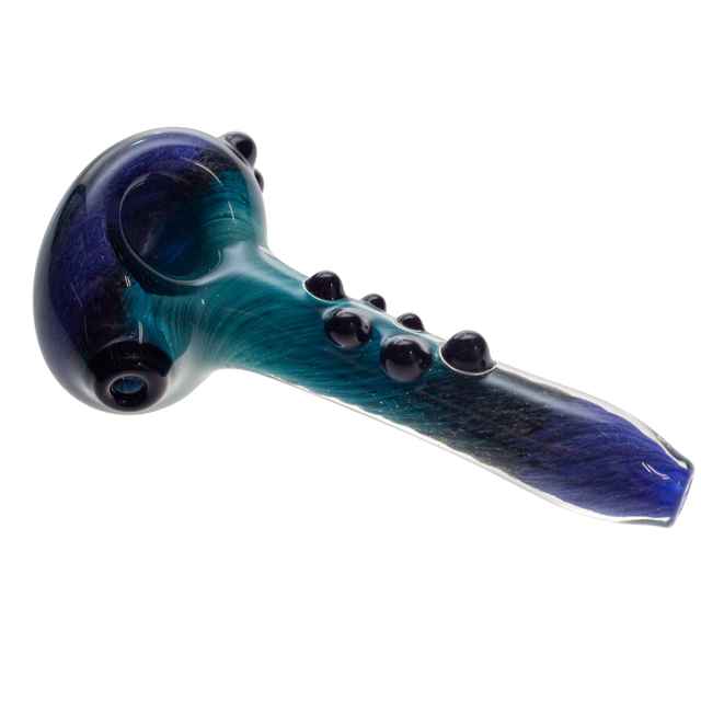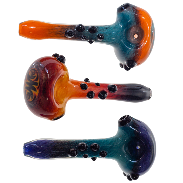 These 4.5" pipes are packed with vibrant color. Weighing in at about 3.2 ounces, these spoons are light and hit smooth. Each hand pipe has about an inch wide bowl, so there is plenty of room for your product. All these pieces feature a unique head design filled with subtle glitter for nice sheen. Carb caps are on the left side and vary in size.