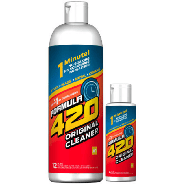Formula 420 for Pyrex, Glass, Metal and Ceramic is the original complete 1 minute cleaner. The exclusive AbrasivAction™ technology eliminates the need for soaking and scrubbing. Simply Shake, Rinse and Enjoy!