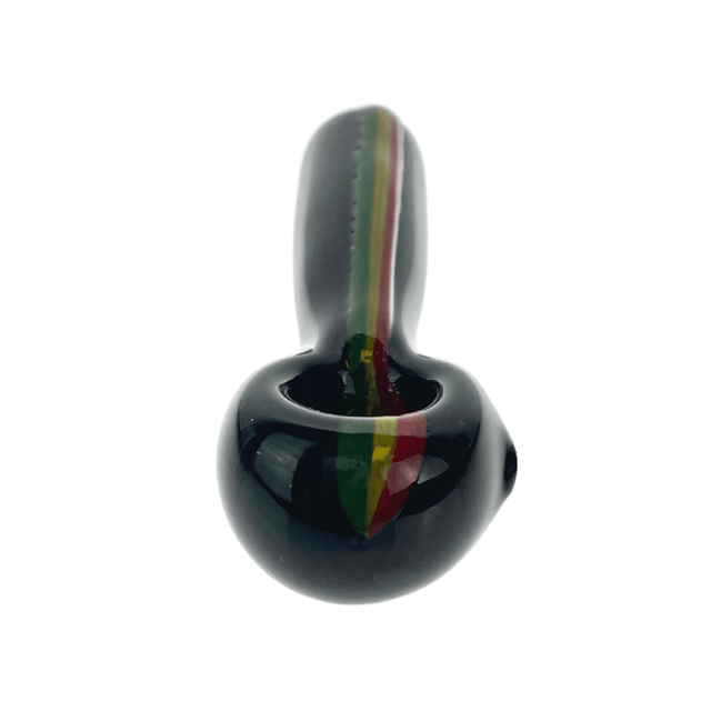 These handmade solid black hand pipes feature the famous rasta colors in stripes going across the whole pipe.