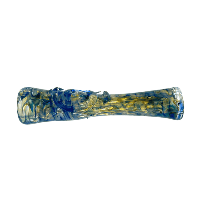 This blue dream flat mouthpiece chillum is colored by an outside wrap n'rake with a silver fume. The flared mouthpiece is also accompanied by an embossed spiral.