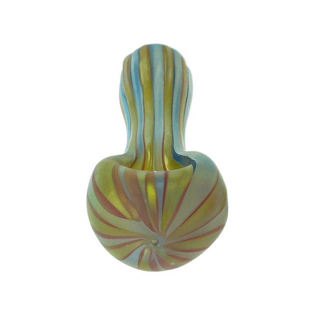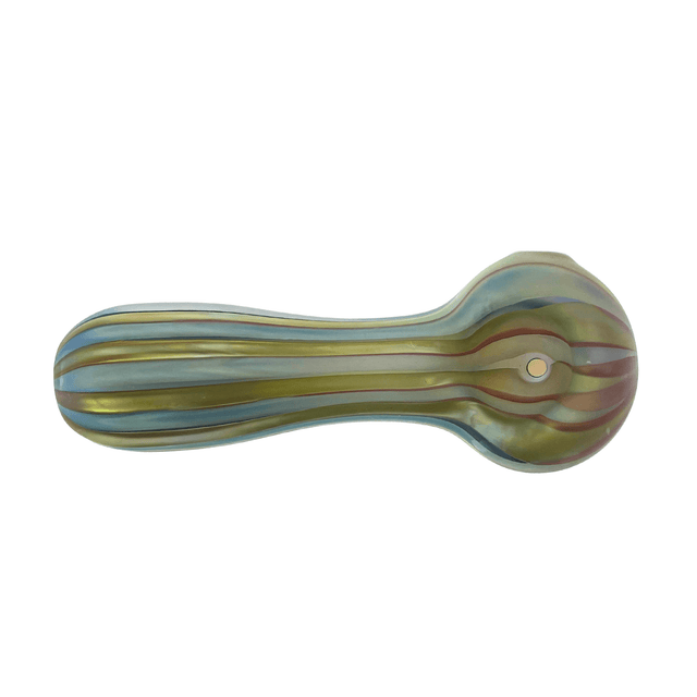 This beauty is not only frosted creating a matte color look but as well as, an inside out silver fume creating a color changing affect. This hand pipe is a durable American made piece that is also adorned with a stripe texture going down the body.