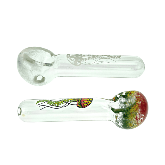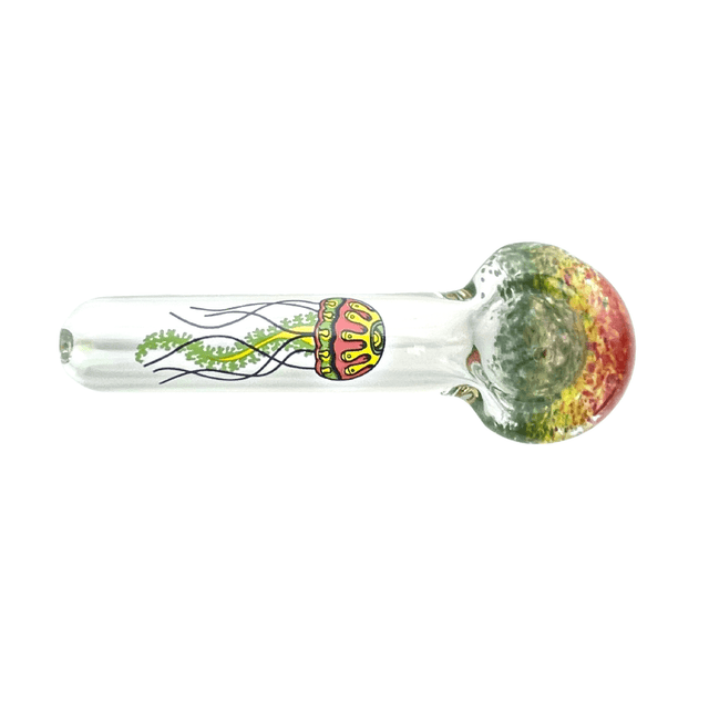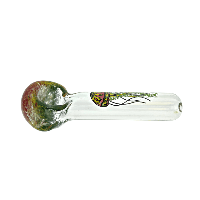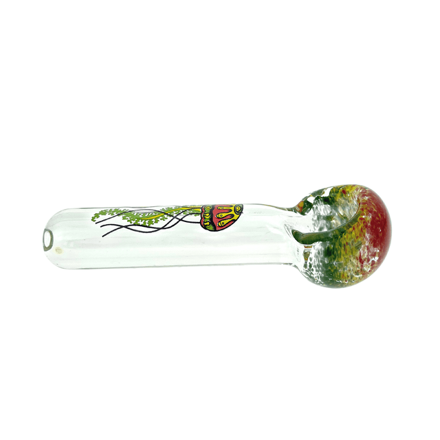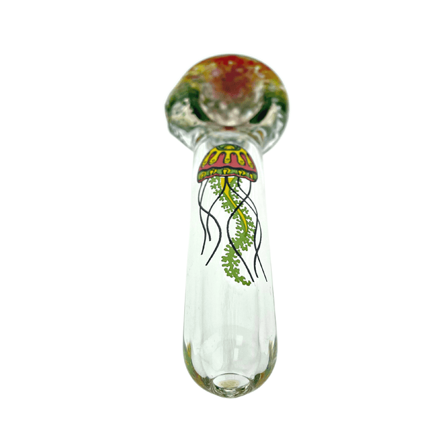 These simple hand pipes have a inside out frit bowl and are adorned with the famous Jellyfish glass blowing company logo on the front.