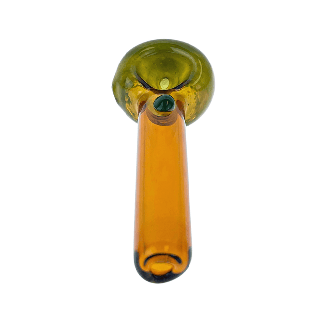 This classic simple hand pipe features more nature colors. The bowl of this durable American made pipe is colored using an inside out frit technique and the dark green bowl is adorned with a green dot as well.
