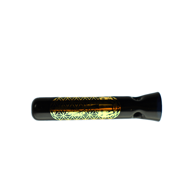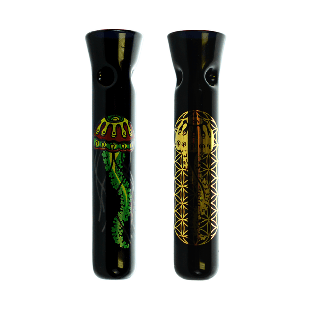 Our triple pinch chillums are great for when you just want a little taste of what you’re smoking. These durable chillums are perfect for concerts, the great outdoors or for when you're on the go. This smaller chillum utilizes a triple pinch restriction making clogging a thing of the past. The black chillum with a flared end has a unique jellyfish and sacred geometry gold design.
