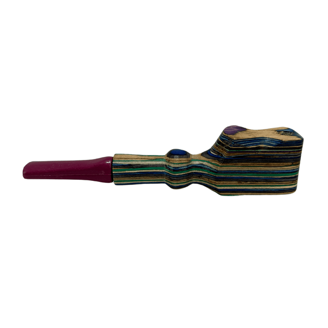 This beautiful handcrafted wooden hand pipe is durable and ergonomic. The top of the bowl has a sliding mechanism to ensure you can contain all your herb when you're not using it. The colors make the piece vibrant and inviting.